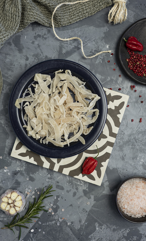 Kalmaar (dosidicus gigas) 85%, keedusool, suhkur, niiskusesäilitaja sorbitool (E420), maitsetugevdaja (E621).